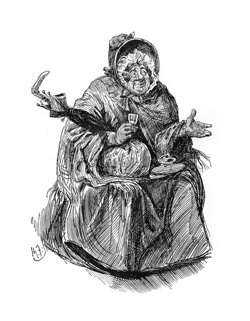 Mrs. Sarah Gamp is een personage uit het boek Martin Chuzzlewit. Zij is vroedvrouw/verpleegster, voor wie de zorg voor zichzelf boven alles gaat. De mensen die haar in dienst hebben genomen komen er vaak bekaaid af. Mrs Gamp is een dikke vrouw met een rode neus van de drank. Zij gedraagt zich als de hertogin van de vuilnisbelt. De wijsheden die zij er uitkraamt zijn legendarisch, maar kloppen nooit! Bakerpraatjes!